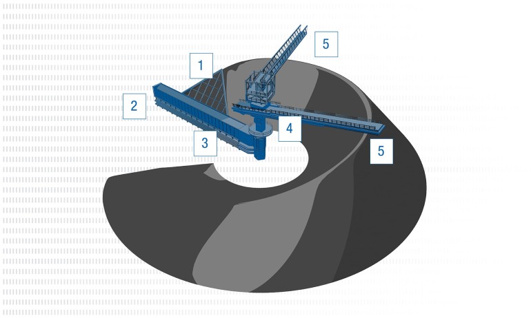 - Über einen Fahrantrieb (2) lässt sich der Kettenkratzer um den Mittelpunkt des Rundmischbetts drehen, sodass das Material kreisförmig abgetragen werden kann.